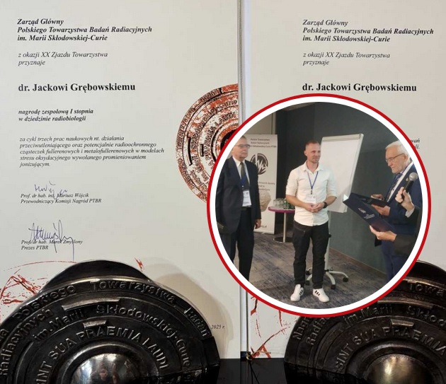 Z ogromną dumą informujemy, że mjr dr Jacek Grębowski, żołnierz i naukowiec Wojskowego Instytutu Medycznego – Państwowego Instytutu Badawczego (WIM-PIB), wraz z zespołem badawczym, w tym prof. Grzegorzem Litwinienką z Uniwersytetu Warszawskiego, został uhonorowany przez Polskie Towarzystwo Badań Radiacyjnych im. Marii Skłodowskiej-Curie (PTBR) dwiema prestiżowymi nagrodami zespołowymi w dziedzinie radiobiologii: