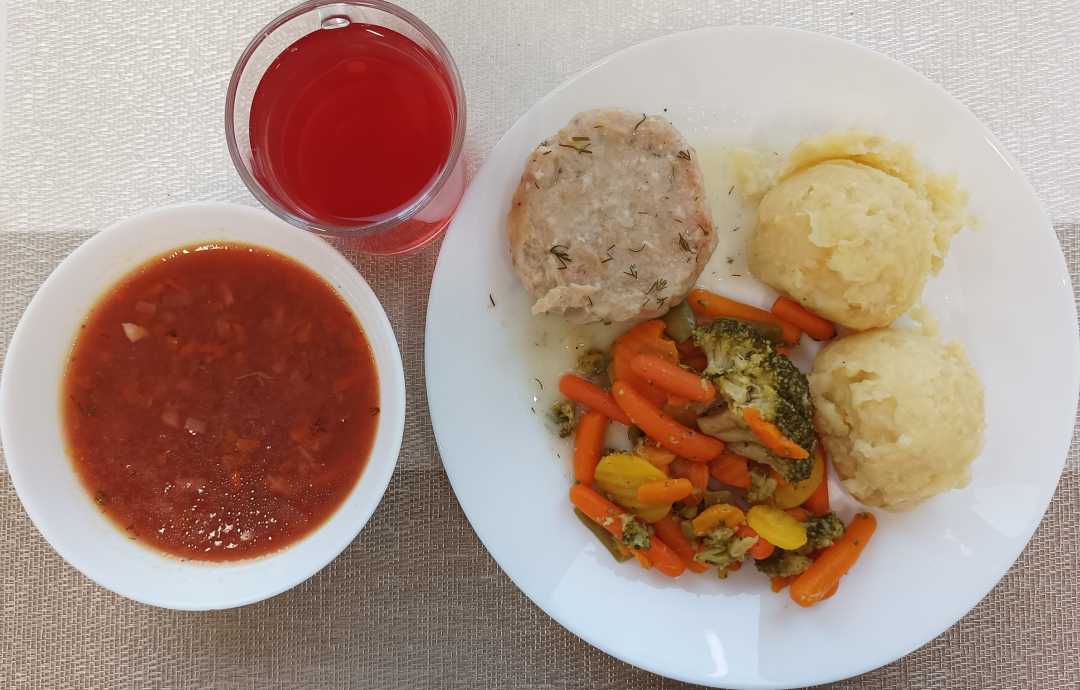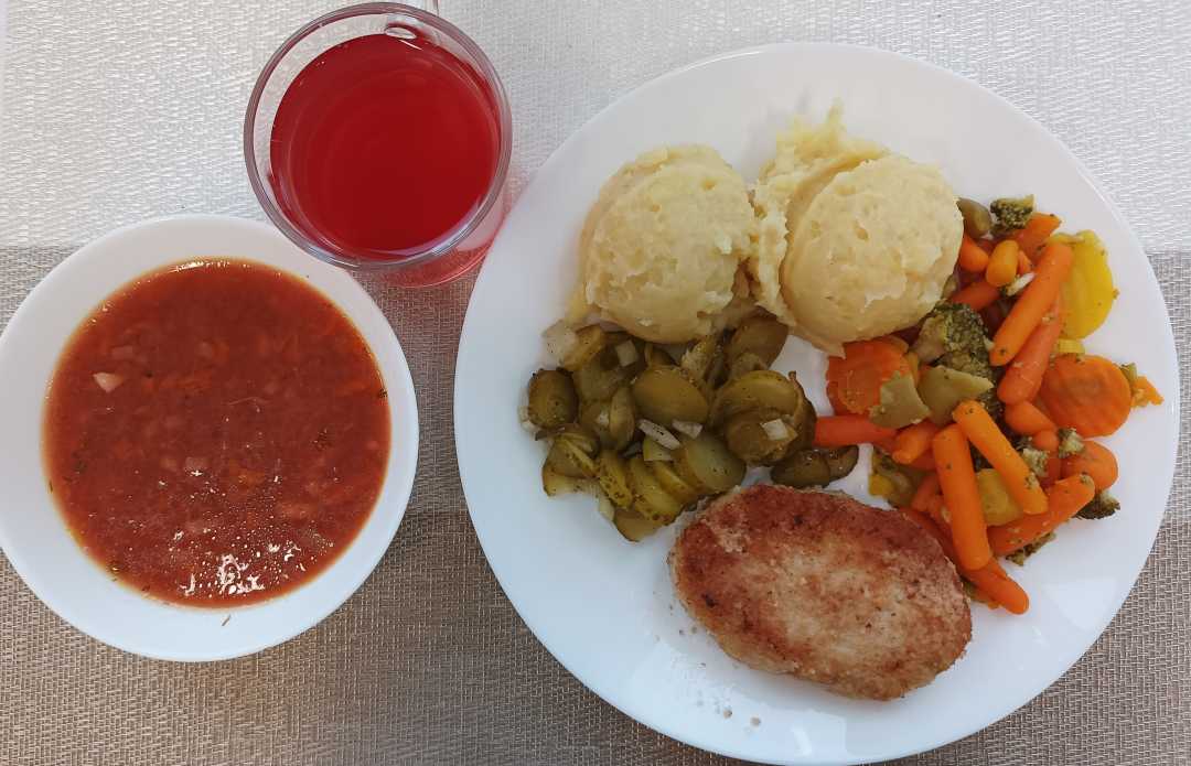 Obiad dieta podstawowa: Barszcz czerwony, Kotlet z ryby z gotowanymi ziemniakami, duszonymi jarzynkami oraz surówką z ogórka kiszonego, kompot owocowy.