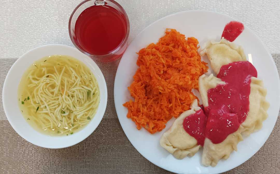 Obiad dieta podstawowa: Rosół z makaronem, Pierogi z serem, musem malinowym oraz surówką z marchewki, kompot owocowy.