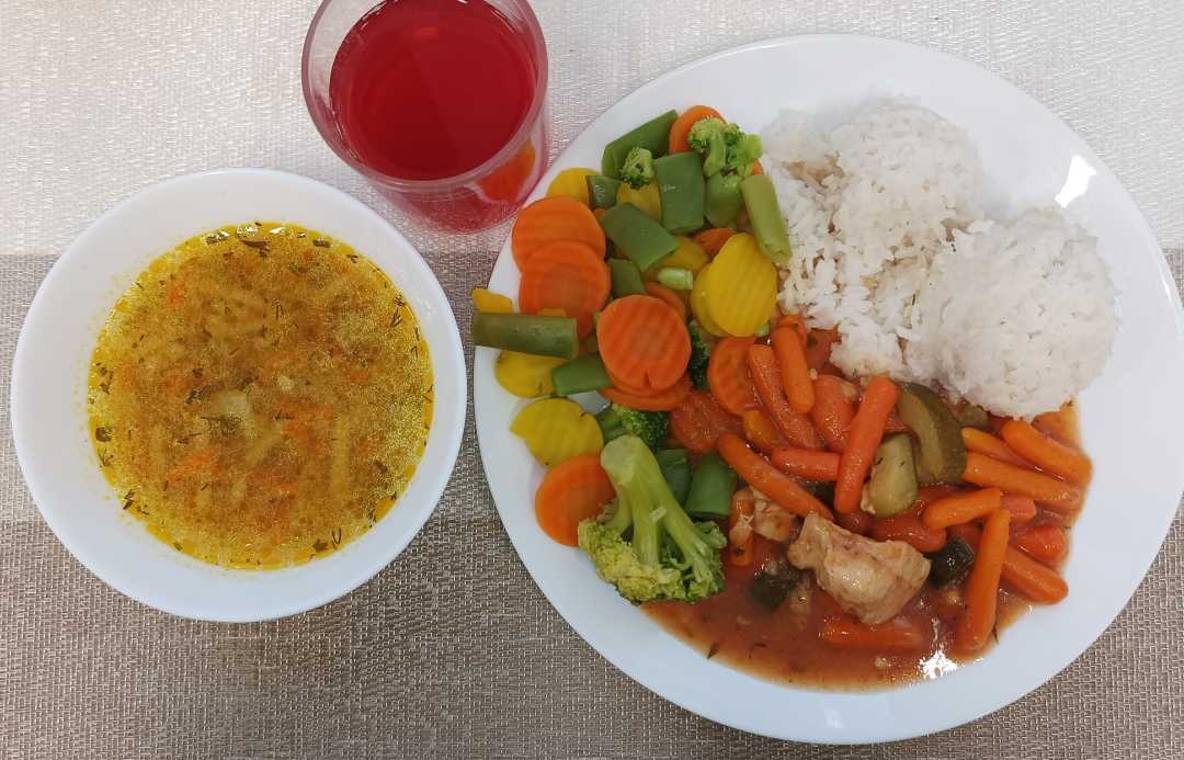 Obiad dieta łatwostrawna: Zupa koperkowa, Leczo z indykiem z gotowanym białym ryżem oraz gotowanym mixem warzyw wiosennych, kompot owocowy.