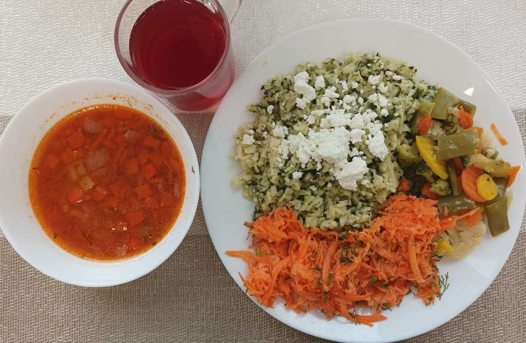 Obiad dieta łatwostrawna: Zupa solferino, Makaron ze szpinakiem i twarogiem z gotowanym bukietem warzyw oraz surówką z marchewki, kompot owocowy.