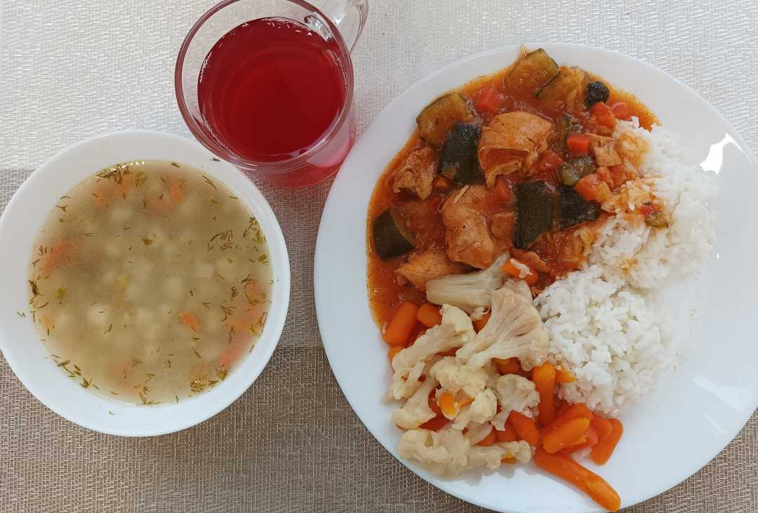 Obiad dieta łatwostrawna: Zupa koperkowa, Lekkostrawne leczo z indykiem z gotowanym białym ryżem oraz gotowanym mixem warzyw wiosennych, kompot owocowy.