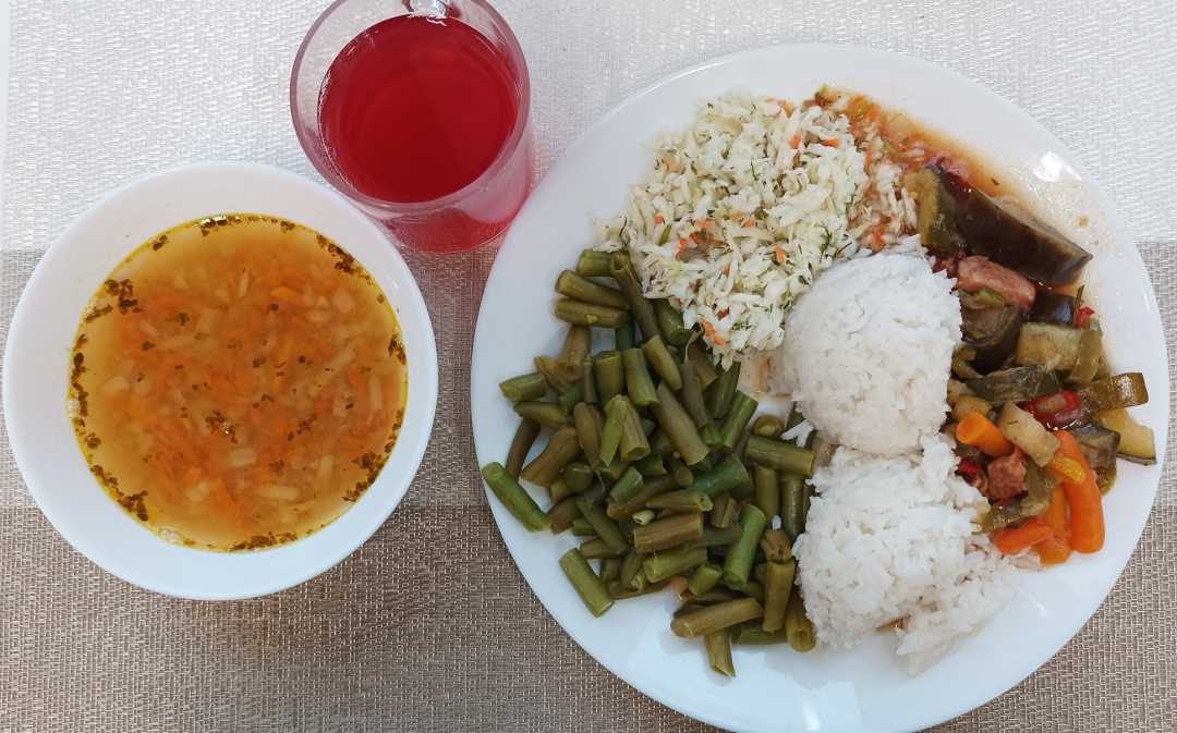 Obiad dieta podstawowa: Zupa grochowa, Leczo z kiełbasą i warzywami z gotowanym białym ryżem, gotowaną fasolką szparagową oraz surówką colesław, kompot owocowy.