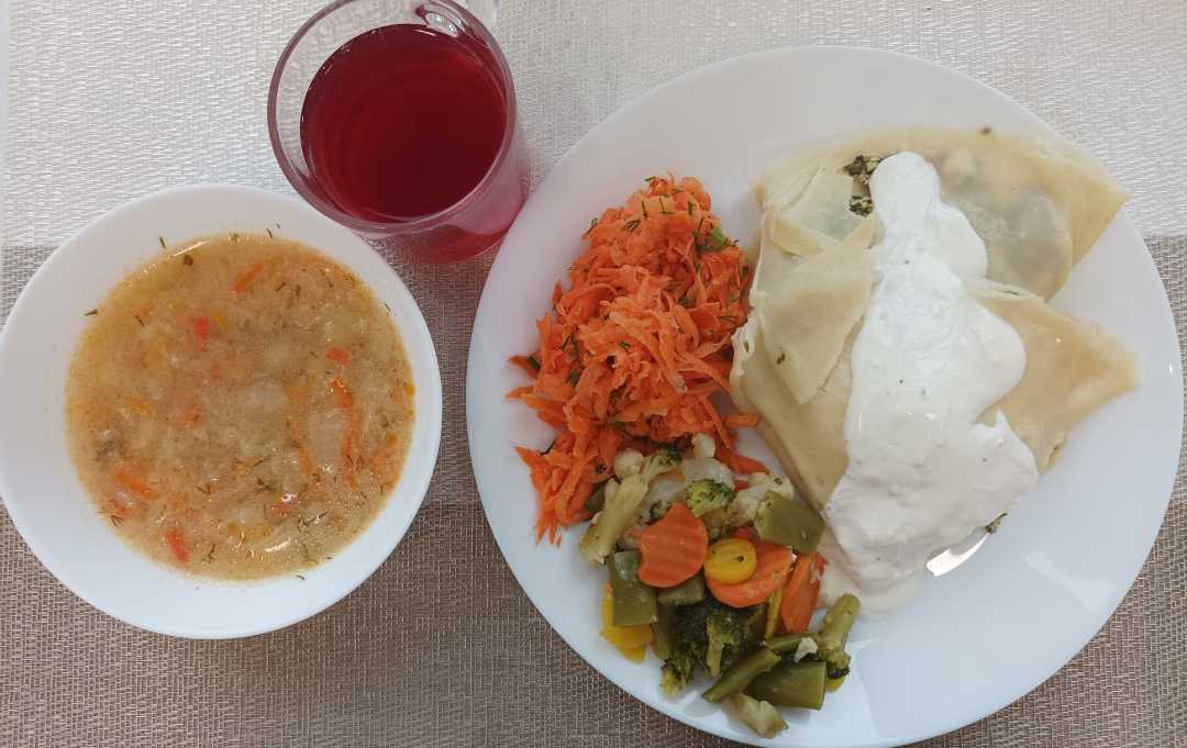 Obiad dieta podstawowa: Zupa kapuśniak, Naleśniki ze szpinakiem i twarogiem z sosem jogurtowo-czosnkowym, gotowanym bukietem warzyw oraz surówką z marchewki, kompot owocowy.
