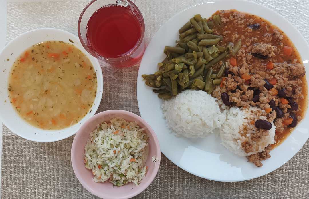 Obiad dieta podstawowa: Zupa grochowa, Mięso mielone w sosie z czerwoną fasolą z gotowanym białym ryżem, gotowaną fasolką szparagową oraz surówką colesław, kompot owocowy.