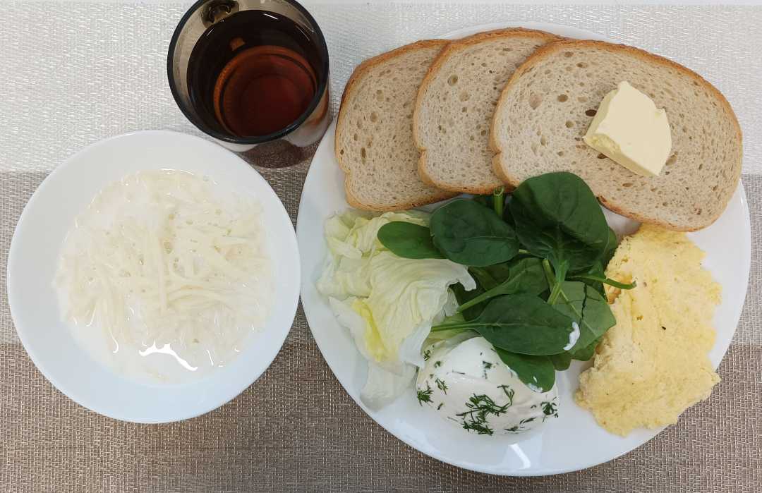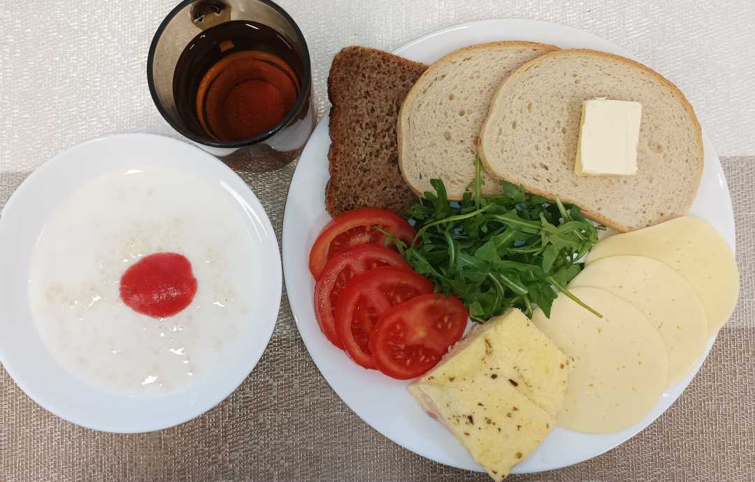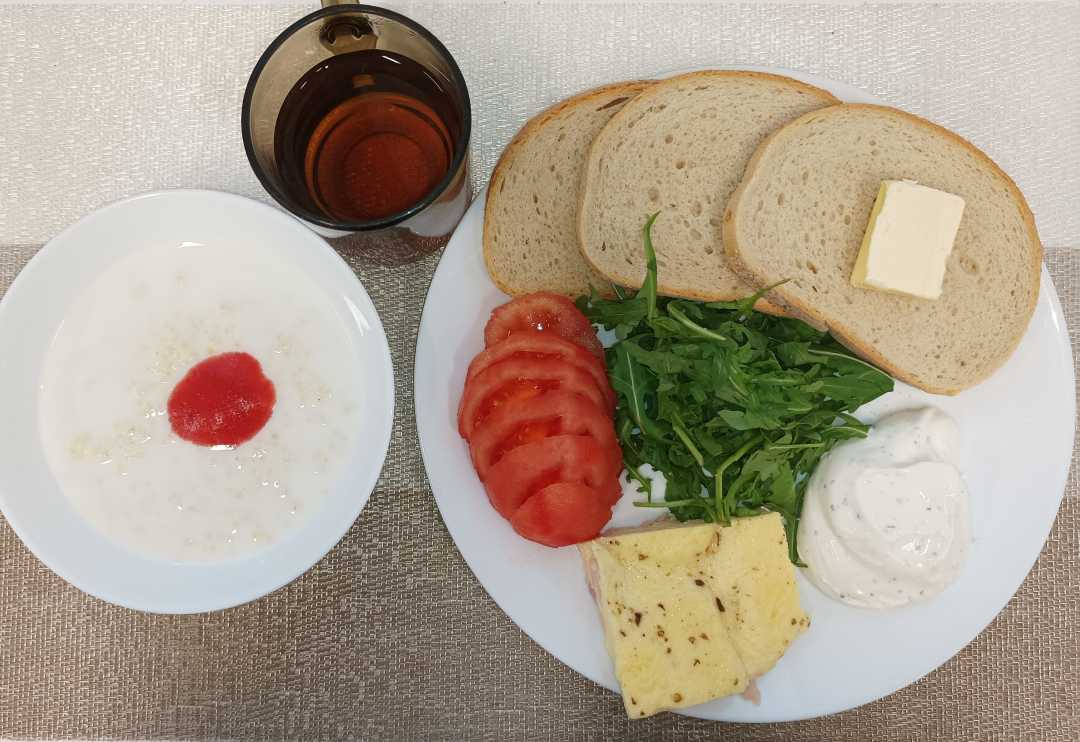 Śniadanie dieta podstawowa: Kasza jaglana na mleku z musem owocowym, Omlet na parze z szynką, Kanapki z pieczywa mieszanego z margaryną, żółtym serem, rukolą oraz pomidorem, herbata czarna.