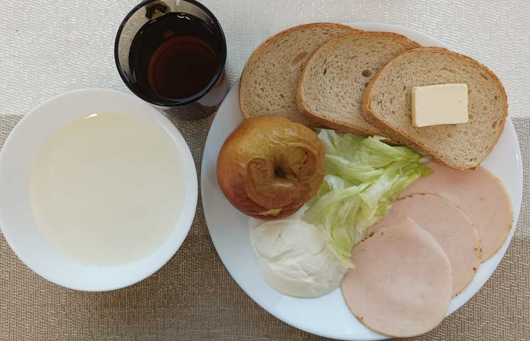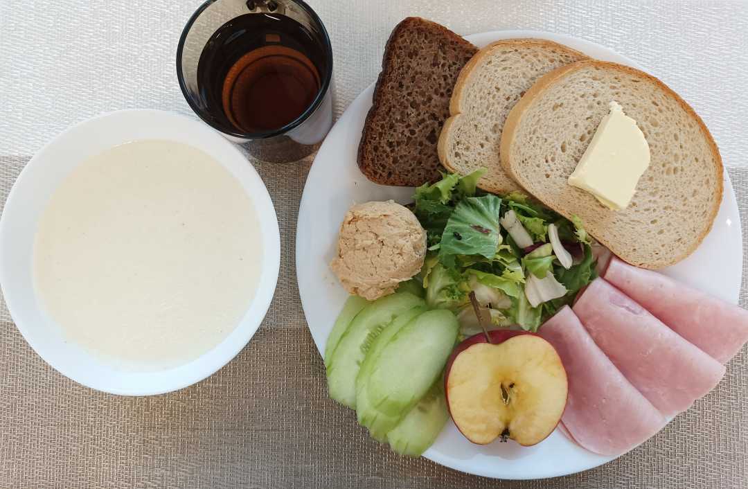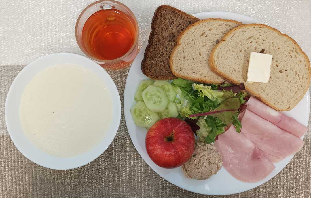 Śniadanie dieta podstawowa: Kasza manna na mleku, Kanapki z pieczywa mieszanego z margaryną, szynką konserwową, pastą z kurczaka, mixem sałat, zielonym ogórkiem oraz jabłkiem, herbata czarna.