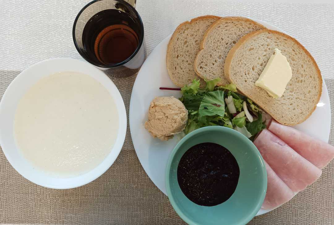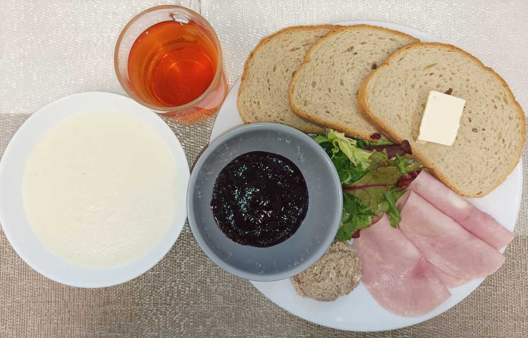 Śniadanie dieta łatwostrawna: Kasza manna na mleku, Kanapki z pieczywa pszennego z margaryną, szynką konserwową, pastą z kurczaka, mixem sałat oraz musem jagodowym, herbata czarna.