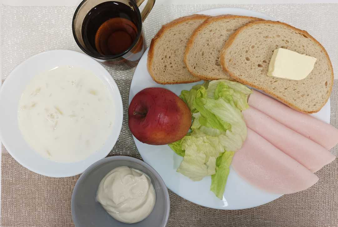 Śniadanie dieta łatwostrawna: Zacierka na mleku, Serek homogenizowany waniliowy, Kanapki z pieczywa pszennego z margaryną, szynką drobiową, sałatą lodową oraz pieczonym jabłkiem, herbata czarna.