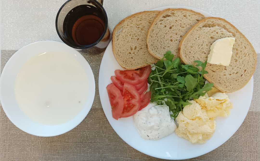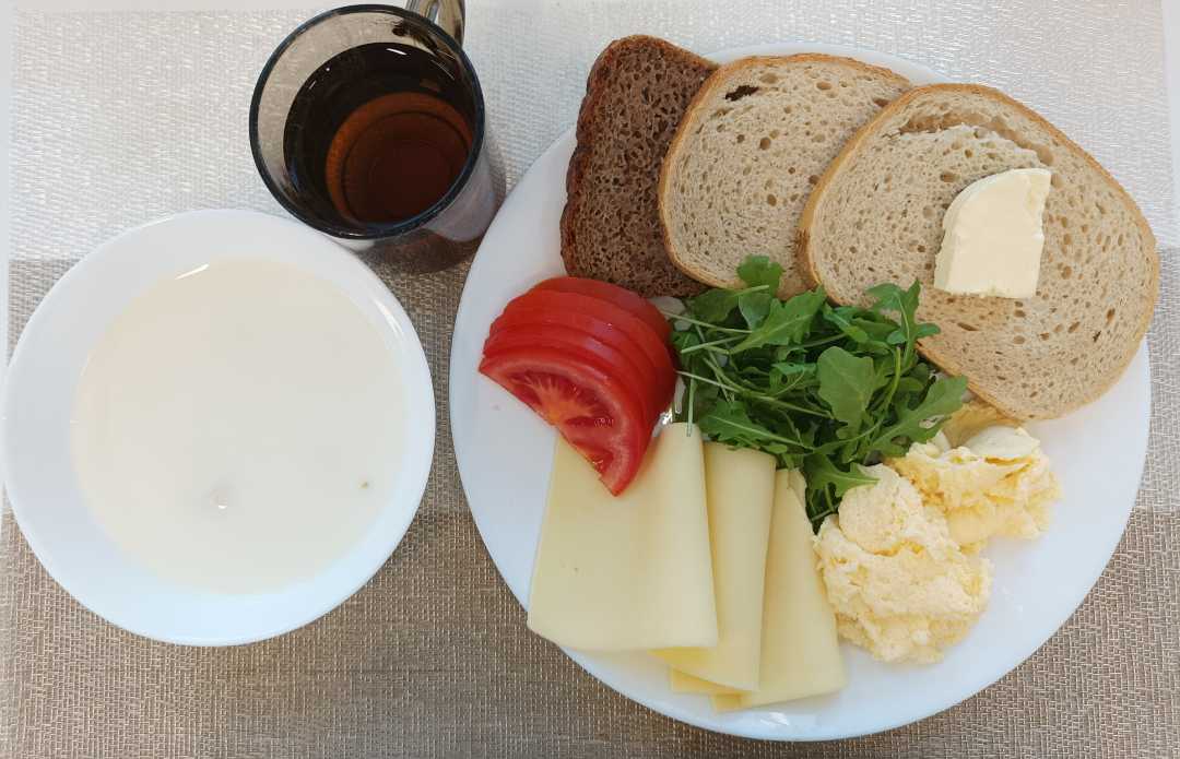 Śniadanie dieta podstawowa: kasza jaglana na mleku, omlet na parze, kanapki z pieczywa mieszanego z margaryną, żółtym serem, rukolą oraz pomidorem, herbata czarna.