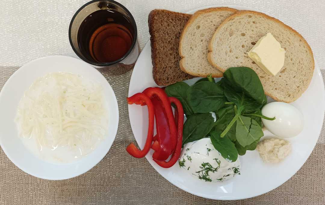 Śniadanie dieta podstawowa: Makaron na mleku, Kanapki z pieczywa mieszanego z margaryną, pastą twarogową z koperkiem, gotowanym jajkiem na twardo z tartym chrzanem, szpinakiem baby oraz papryką, herbata czarna.