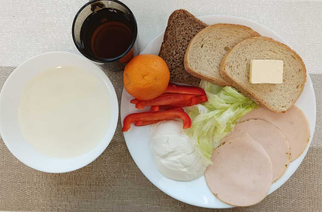 Śniadanie dieta podstawowa: Zacierka na mleku, Kanapki z pieczywa mieszanego z margaryną, szynką drobiową, serkiem homogenizowanym naturalnym, sałatą lodową, papryką oraz mandarynką, herbata czarna.