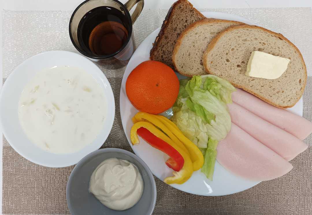 Śniadanie dieta podstawowa: Zacierka na mleku, Serek homogenizowany waniliowy, Kanapki z pieczywa mieszanego z margaryną, szynką drobiową, sałatą lodową, papryką oraz mandarynką, herbata czarna.