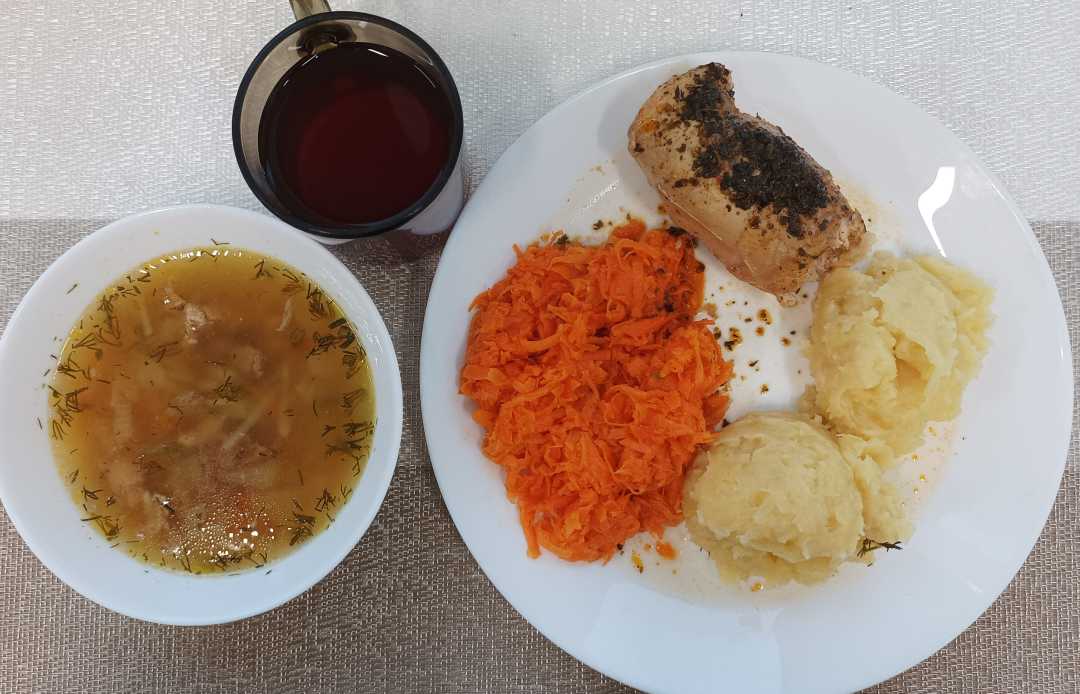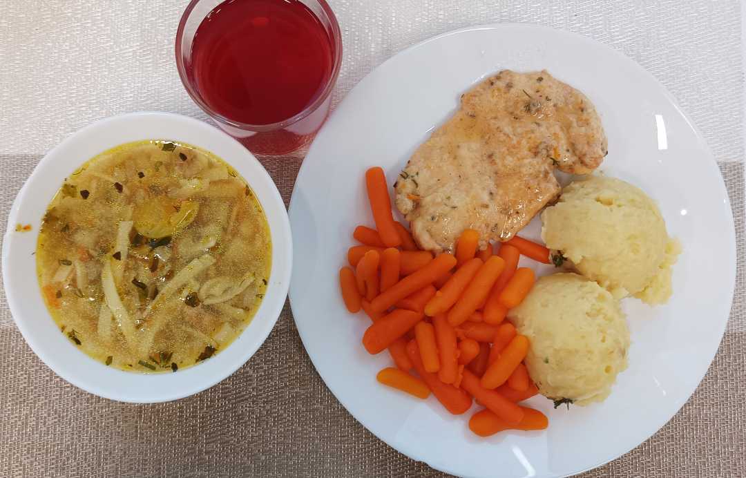 Obiad dieta łatwostrawna: Zupa jarzynowa z makaronem orzo, Mięso z kurczaka w sosie potrawkowym z gotowanymi ziemniakami oraz gotowaną marchewką, kompot owocowy.