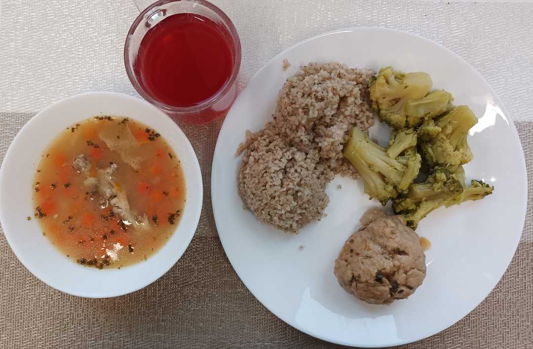Obiad dieta łatwostrawna: Zupa ziemniaczana, Klopsik wieprzowy w sosie bazyliowym z gotowaną kaszą jęczmienną oraz gotowanym brokułem, kompot owocowy.