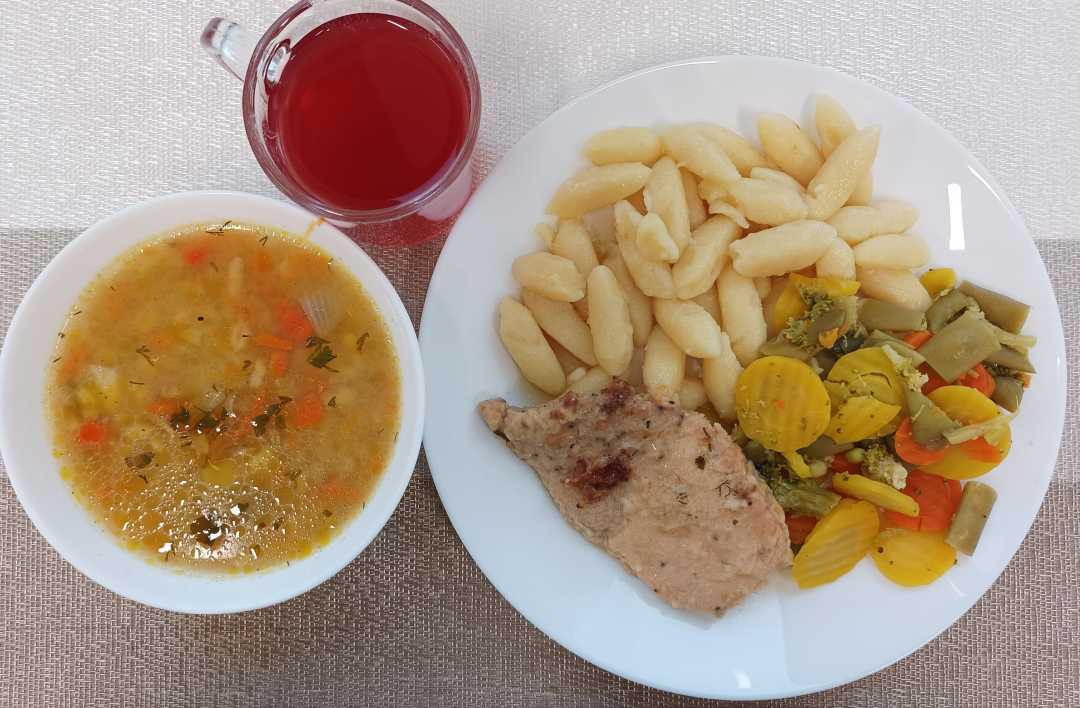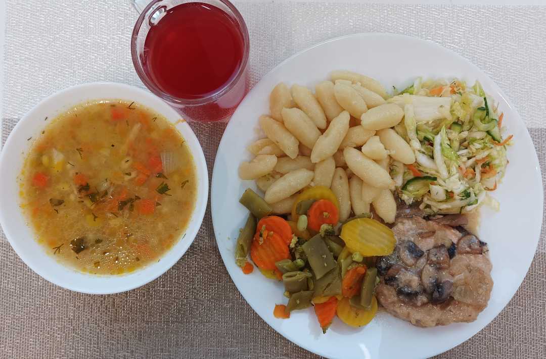 Obiad dieta podstawowa: Krupnik, Schab w sosie pieczarkowym z gotowanymi kopytkami, gotowanym bukietem warzyw oraz surówką z kapusty pekińskiej, kompot owocowy.