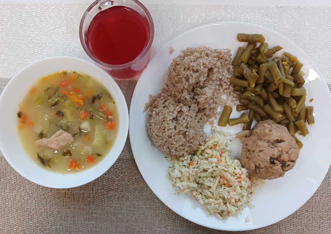 Obiad dieta podstawowa: Zupa ogórkowa, Klopsik wieprzowy w sosie bazyliowym z gotowaną kaszą jęczmienną, gotowaną fasolką szparagową oraz surówką colesław, kompot owocowy.