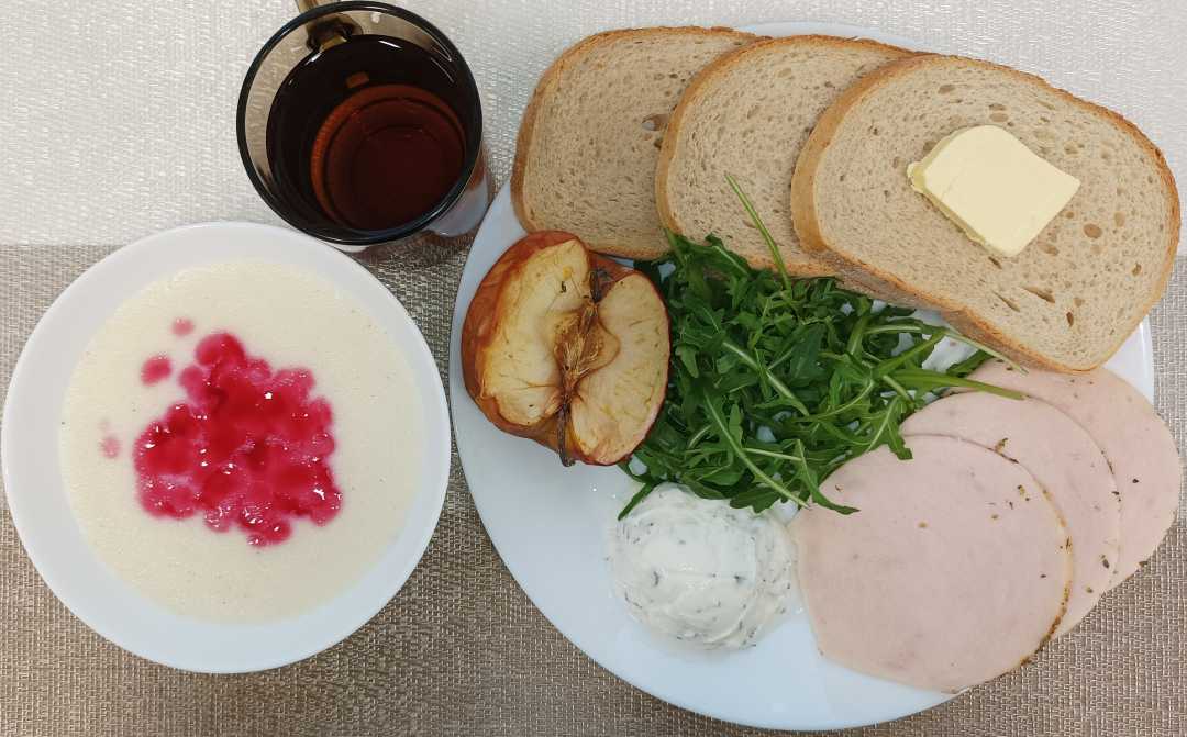 Śniadanie dieta łatwostrawna: Kasza manna na mleku z syropem malinowym, Kanapki z pieczywa pszennego z margaryną, wędliną z indyka, twarożkiem z koperkiem, rukolą oraz pieczonym jabłkiem, herbata czarna.