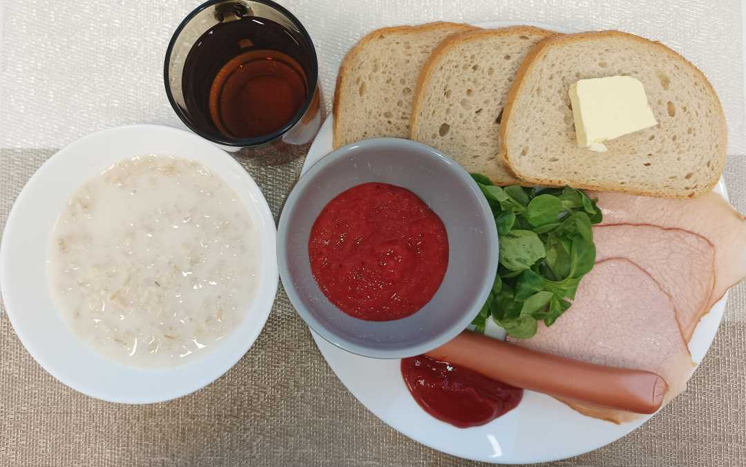 Śniadanie dieta podstawowa: Płatki owsiane na mleku, Gotowana parówka z kurczaka z musztardą, Kanapki z pieczywa mieszanego z margaryną, polędwicą sopocką, roszponką oraz rzodkiewką, herbata czarna.