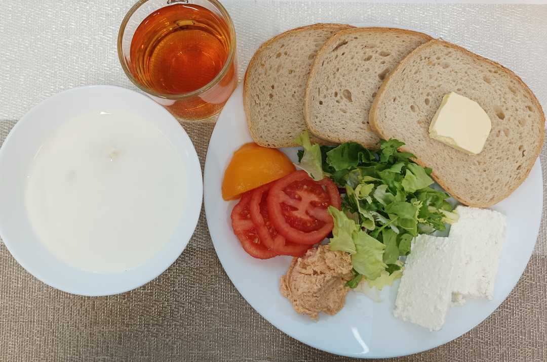 Śniadanie  dieta łatwostrawna: Kasza jaglana na mleku, Kanapki z pieczywa pszennego z margaryną, serem białym chudym, pastą z kurczaka i warzyw, mixem sałat, pomidorem bez skóry oraz brzoskwinią w syropie, herbata czarna.