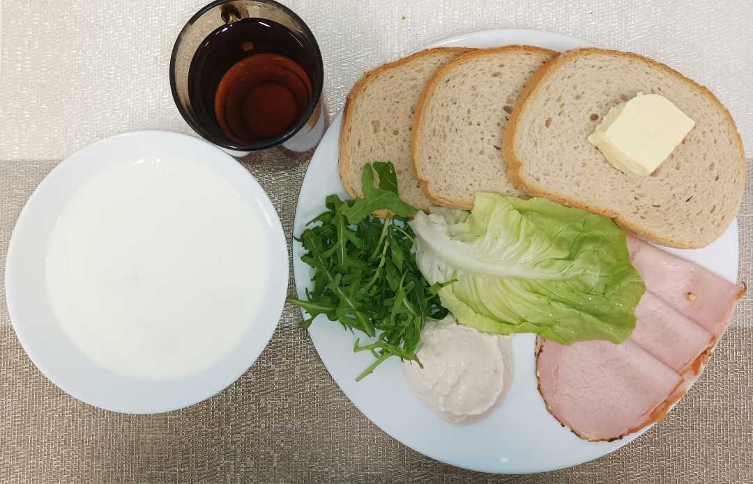 Śniadanie dieta łatwostrawna: Ryż na mleku, Kanapki z pieczywa pszennego z margaryną, szynką wiejską, pastą z tuńczyka, sałatą masłową oraz rukolą, herbata czarna.