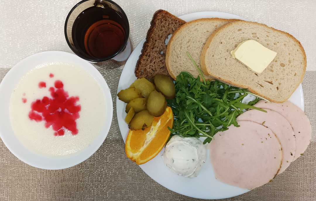 Śniadanie dieta podstawowa: Kasza manna na mleku z syropem malinowym, Kanapki z pieczywa mieszanego z margaryną, wędliną z indyka, twarożkiem z koperkiem, rukolą, ogórkiem kiszonym oraz cząstką pomarańczy, herbata czarna.